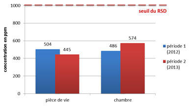 - en 2013, après rénovation du logement, un niveau de confinement faible et majoritairement en dessous du seuil de 1000 ppm fixé par le règlement sanitaire départemental (RSD). Par rapport à la campagne de mesures avant rénovation, on note un confinement relativement stable, en légère diminution dans la pièce de vie et en légère augmentation dans la chambre.